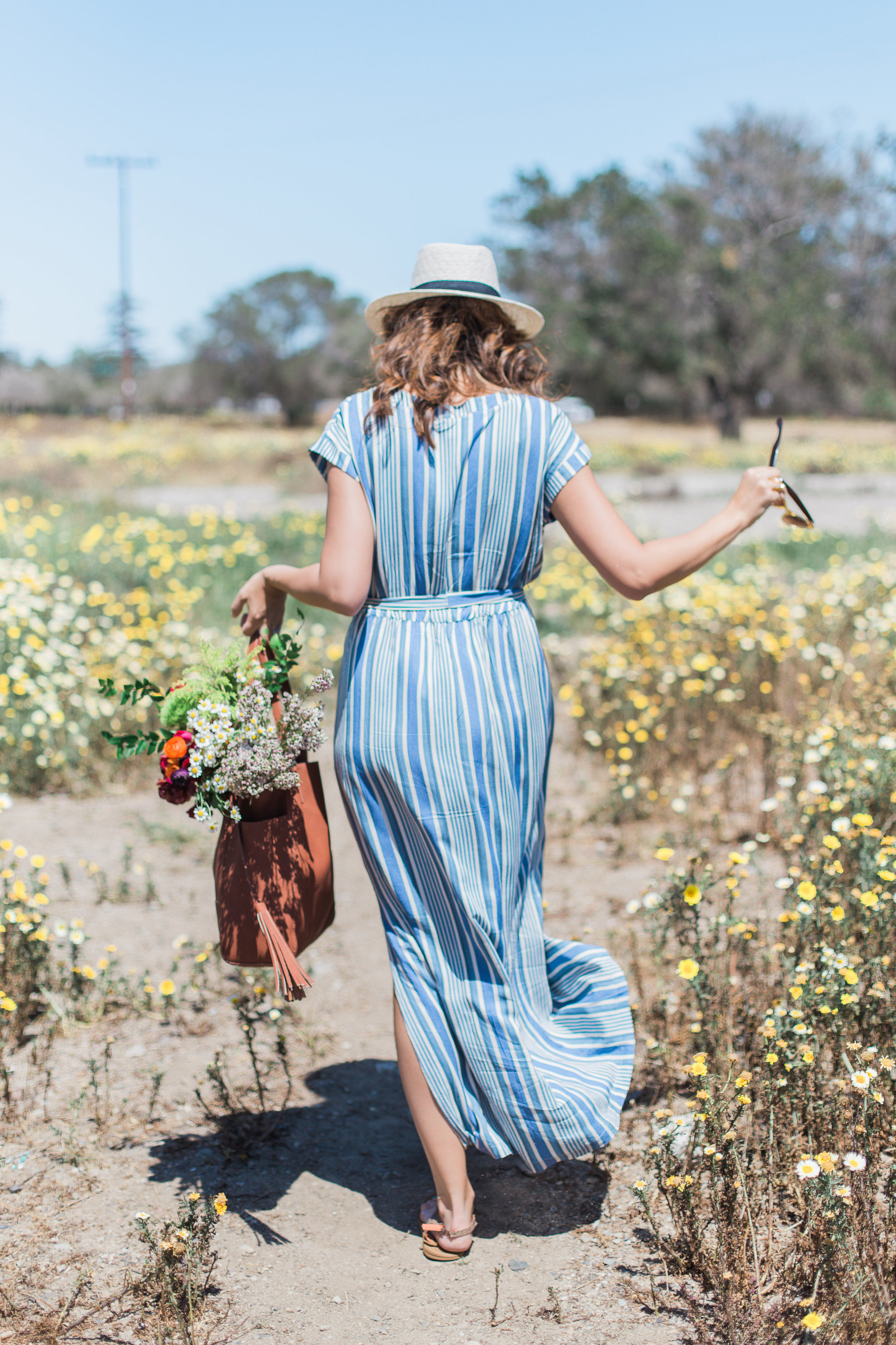 Can I get an "Amen!" for April showers! It may not be May yet but we know that rainy weather doesn't last long here in Southern California. The rain this season has brought us green hills and an abundance of wildflowers in the fields of San Juan Capistrano. Heather of Heather Shane Photography and I hit the fields and brought along a bag of market-bought flowers - all CA Grown! Heather was sweet enough to put up with my pathetic "modeling" skills and capture me in a little slice of heavenly wildflower fields.
